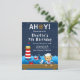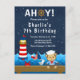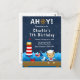Denna söta och roliga inbjudan visar en nautisk sjöman ap-monkey på ett trädäck med en mås och en krabba. I bakgrunden finns en röd och vit fyr, en söt fågel på en segelbåt, havsvågor och en marinblå stjärnklar natthimmel. Texten kombinerar feta och serif-typsnitt för en stilren och modern look. Detta är perfekt för en nautiskt tema födelsedagsfest.