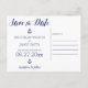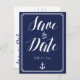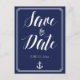 Nautical bröllop Spara datum postkort med vit ram, ankare och anpassad vit text - du kan ändra text, tryckt på marinblå bakgrund