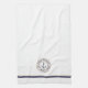 Nautical Chef personlig anchor logotyp handduk med ditt namn och båt namn. Vit med marin blå och brunt cirkelemblem med klassisk blocktext. Dubbla marin blå och brunt invändigt gräns.