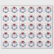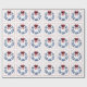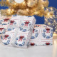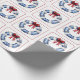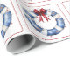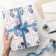 This cute coastal inspired gift wrap features a nautical blue and white life preserver wreath decorated with a red bow and Christmas lights.
