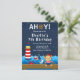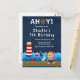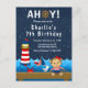 Denna söta och roliga inbjudan visar en nautisk sjöjungfru apa på ett trädäck med en mås och en krabba. I bakgrunden finns en röd och vit fyr, en söt fågel på en segelbåt, havsvågor och en marinblå stjärnklar natthimmel. Texten kombinerar feta och serif-typsnitt för en stilren och modern look. Detta är perfekt för en nautiskt tema födelsedagsfest.