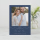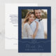 Vårt minimala och elegant marin och vita nautiskt temade fototack är perfekt för ett havstemat nautiska bröllop. Den främre konstruktionen har vår handritade hjärtformade linbild med "Tack" designad i en elegant som löper i skript. "Tack" är designat i en elegant som använder skripttypografi. Anpassa med fotot. Det vassa vita och djupa färg skapar ett modernt nautiskt koncept. Den omvända sidan visar vår handdragna lineillustration tillsammans med ett personligt budskap och parets namn. Alla illustrationer är handritade originalbilder av Moodthology.