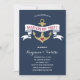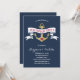 Denna nautiska bröllopsjubileumsfest inbjudan har ett falskt guld glitterankare, en blå och vit vintage banner, ett sött rött hjärta och en marinblå bakgrund.