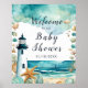 Vacker baby shower-plakat med en nautisk svart-vit fyr, sjöstjärna och sniglar. Perfekt för ett bröllop. Orden kan ändras för att passa dina egna detaljer eller krav