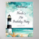 Vackra födelsedagsfester poster med en sjösvart och vit fyr, stjärnfisk och snäckor. Perfekt för en födelsedagsfest. Ord kan ändras till kostym med dina egna uppgifter eller krav