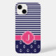 Cute Modern Girly Trendig Chic Snyggt Fodral Design med Preppy Vågrät Rand och Cute Nautical Anchors Mönster med Anpassningsbar Personlig Monogram Initial i ett marockanskt Quatrefoil Klöver Gräns Ram