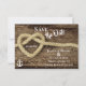 Vi Gifter sig Spara datummeddelandet i bröllop har ett nautiskt rep som är bundet i form av ett hjärta och en vit ankare med en rustik träbakgrund. ^