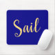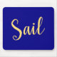 Den här sportiska varma väderdesignen har stor centrerad "Sail" skriven i festiv skripttext. Bakgrunden är royalets marinblått djupa rik.