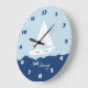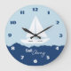 Stylish nautical wall clock featuring a white sailing boat silhouette on a soft blue background with deep blue ocean waves. The design captures the peaceful feeling of the sea and open horizons. The phrase “Sail Away” adds a sense of adventure and freedom, perfect for lovers of the ocean and coastal decor.