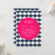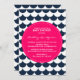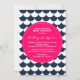 Baby shower inbjudan med marinblå och vit scallop / vågor mönster och varmt rosa märke. Modern och lekfull - perfekt för strand och nautiska tema baby shower.