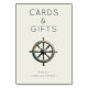 This wedding tabletop sign features a nautical theme with a beautifully detailed ship's wheel at the center, rendered in metallic silver and bronze tones for an elegant, aged look. The design is minimalistic, with clean lines and ample white space that highlights the centered text "CARDS & GIFTS" in a modern sans-serif font above the wheel, and "thank you" below it, creating a balanced composition. The neutral color palette of whites and grays complements the sophisticated maritime motif, making this sign perfect for expressing gratitude at your wedding reception. Its understated luxury conveys a mood of refined appreciation, ideal for celebrating love and thanks in style.