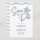 Nautisk spara datumkortet med ett marint blått handskriftsskript och en stjärnbild på en vit bakgrund. Omvänd sida är en hand plockade-våg mönster. Perfekt för kust-, strand- och havsteman.