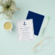 Nautisk inbjudningskort för möhippan-flygare med enkel och modern design med ett marint blåankare tillsammans med dina händelsedetaljer inuti ett gräns, över en vit bakgrund. En elegant som är perfekt för en sommarkust, som firande vid stranden. Dessa billigtar inbjudningskort för möhippa trycks på lakan av papper för ett budgetvänligt alternativ. OBSERVERA: Dessa omfattar inte kuvert.
