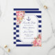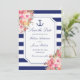 Perfekt för att meddela bröllop, denna Spara datumkort innehåller ett nautiskt tema blåankare för marinen med rep och en blå och vit strimlad bakgrund som accentueras av ro med vattenfärg i skuggor av rosa, korall och persikor. Anpassa texten med dina egna uppgifter om bröllop. Designad av konstnären ©Susan Coffey.