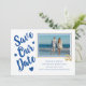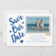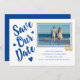 Två ankar spara-till-datum-bröllop-meddelandekort med fotomall och stor text. Tungt blå text på vitt med "spara our / date" i extra stor text. Små blåhjärtan och ankare i guld är en del av den nautiska utformningen för ett havsälskande par att tillkännage ett giftermål-datum. Den tryckta texten under fotot kan användas för att skicka gäster till en webbplats i bröllop, eller för att ta med speciell daginfo i stycket. Omvänd är helblått.