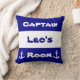 En bred, vit strimling går över den här marina blå dekorativ kudde och skapar en marin blå rand överst och grund. Toppen rand säger "kapten" i vit text. Du kan anpassa den vita randen i mitten med önskad marin blå text. I grund ligger marinen rand vid ord med en vit båtankare på båda sidor om ord.