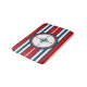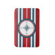 Nautisk design med kompass-dekoration i rund form på röd, blå och vit strimlad bakgrund