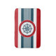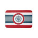 Nautisk design med kompass-dekoration i rund form på blå, röd och vit strimlad bakgrund