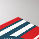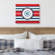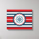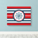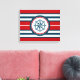 Nautisk design med kompass-dekoration i rund form på röd, blå och vit strimlad bakgrund