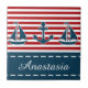 Nautisk design med segelbåt och ankarplats dekoration på röd och vit strimlad bakgrund
