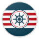 Nautisk utformning med segelhjulets dekoration i rund form med stjärnor på röd, blå och vit strimlad bakgrund