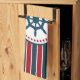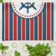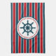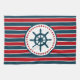Nautisk utformning med segelhjulets dekoration i rund form med stjärnor på röd, blå och vit strimlad bakgrund