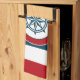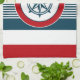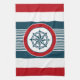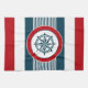 Nautisk design med kompass-dekoration i rund form på blå, röd och vit strimlad bakgrund