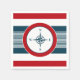 Nautisk design med kompass-dekoration i rund form på blå, röd och vit strimlad bakgrund