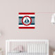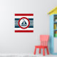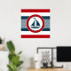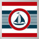 Nautisk utformning med dekoration i rund form av segelbåt på blå, röd och vit strimlad bakgrund