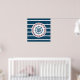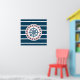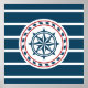 Nautisk design med kompass-dekoration i rund form på blå och vit strimlad bakgrund
