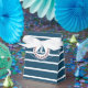 Nautisk konstruktion med dekoration i rund form av segelbåt på blå och vit strimlad bakgrund