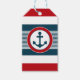 Nautisk design med ankarpunkt i rund dekoration på blå, röd och vit strimlad bakgrund