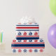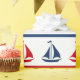 Nautisk design med segelbåt och kompassad dekoration på röd, blå och vit strimlad bakgrund