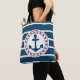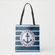 Nautisk design med ankarpunkt i rund dekoration på blå och vit strimlad bakgrund