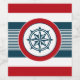 Nautisk design med kompass-dekoration i rund form på blå, röd och vit strimlad bakgrund