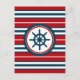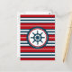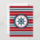 Nautisk utformning med segelhjulets dekoration i rund form på röd, blå och vit strimlad bakgrund