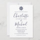 Nautisk fartygsratt marinblå skrivstil bröllop inbjudningar