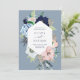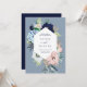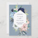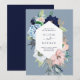 Den här snyggten och trendigets bröllopsinbjudan innehåller ett modernt geometriskt ram med vattenfärgblommor från nautisk färgad. Hydrangea, peony och anemonblommor förekommer i nyanser av marinblått, ljusblått och rosa med grönt och neutralt beige löv. Kortets bakgrund är en dammig blå färg och kortets baksida är mörk, marin blå.