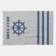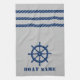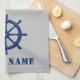 Anpassningsbar Nautical Fraktas Wheel Helm och Rope Rand med Personlig Boat Namn i Deep Navy Blue på en Snyggt Sea Grått Kitchen Towel.