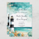 Vacker bröllopsinbjudan med en nautisk svart-vit fyr, sjöstjärna och sniglar. Perfekt för ett bröllop. Orden kan ändras för att passa dina egna detaljer eller krav
