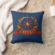 Denna nautisk kudde har en brun frakt av trä som accentueras av guld löv och en röd banderoll som lyder "kapten" på en marin blå bakgrund. Designad av Susan Coffey.