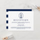 Unika nautiskt tema mottagningskort med vintage stil fyr och en marinblå och vit randig bakgrund på baksidan.