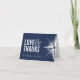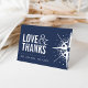 Designat att samordna med vår Nautical Modern bröllopsinbjudningssvit, har de här marinblå och vita tackkorten "Kärlek & Tack" i fet vit stil med ditt namn eller val av personalisering och en vit kompass illustration. Lägg till ett tillvalsmeddelande inuti för att göra tackkortet till en bricka.