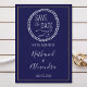 Ett minimalt nautiskt tema sparar datumkortet. En vit repandekrans på en marin blå bakgrund med guld ram och briden och groomens namn i elegant. En del av Nautical Sailboat Minimal Bröllop Suite.