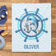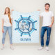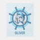 Personligad söt nautisk fluffig filt med en söt delfin och ankare inuti ett skeppsratt med en blå och vit chevronmönstrad bakgrund,