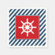 Nautisk tematisk utformning med segelhjulets dekoration i kvadrat på blå och vit strimlad bakgrund