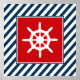 Nautisk tematisk utformning med segelhjulets dekoration i kvadrat på blå och vit strimlad bakgrund