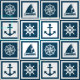 Nautisk tematisk dekoration med segelhjul, segelbåt, kompass och ankarplats i vita och blåstrimlade fyrkanter