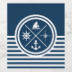 Nautisk tematisk utformning med nautiska symboler (ankare, segelbåt, segelhjul, kompass) dekoration på vit och marin blå strimlad bakgrund.