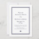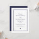 Nautiska marinblå krabb-inbjudningar till repetitionsmiddag inför bröllop. Framsida - vit med dubbel marinblå ram, block- och skrivstil marinblå text och marinblå krabb-illustration längst ner i mitten. Baksidan är enfärgat marinblå.